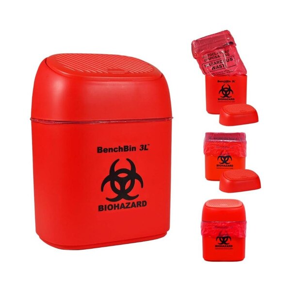 - Includes BenchBin 3L™ and 400 autoclave-safe biohazard bags